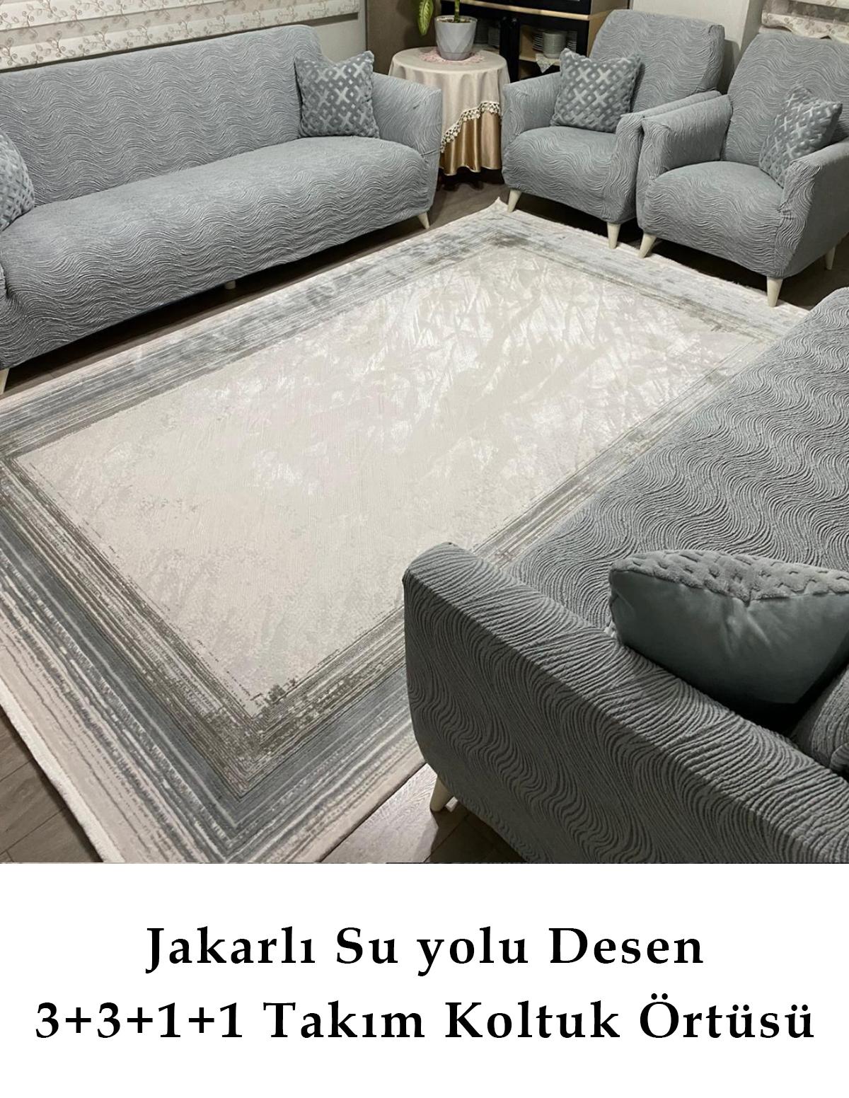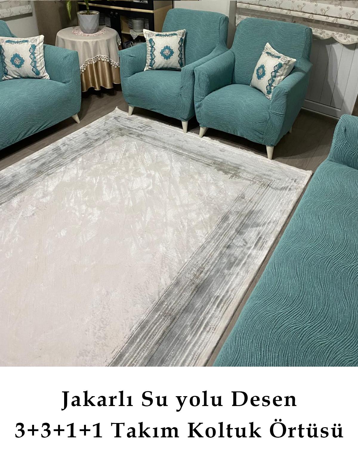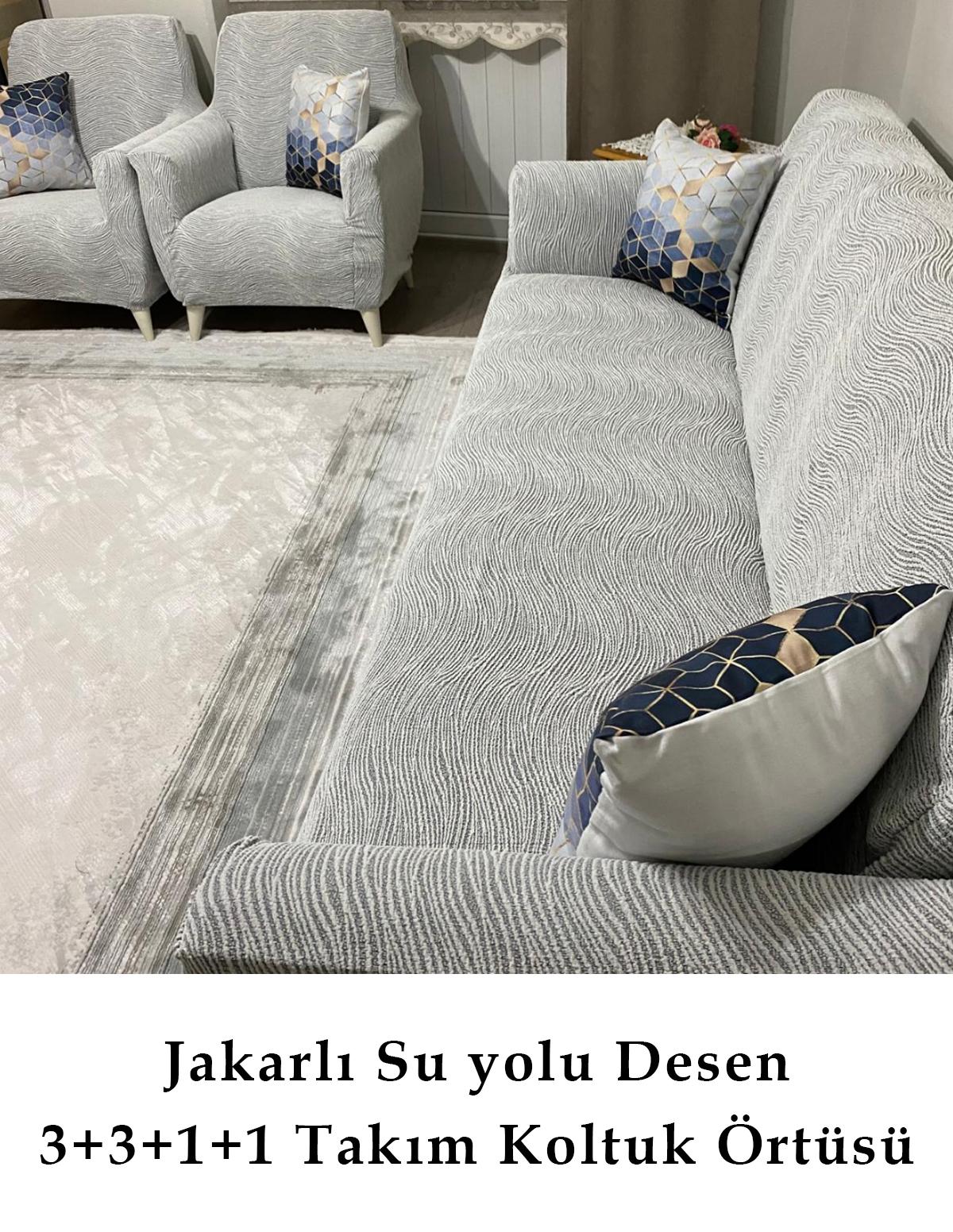 - Su yolu desenleriyle modern ve şık bir görünüm sunan jakarlı koltuk örtüsü, mekanınıza estetik bir dokunuş katıyor.